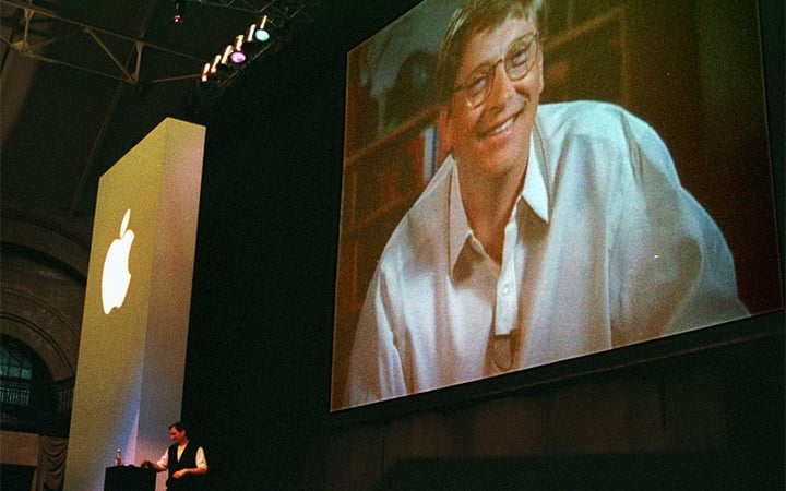 论戏剧性,比尔盖茨出现在 1997 年的 Macworld 可谓是史无前例。当时,乔布斯刚刚回到苹果,两家公司虽然还是合作关系,但是在专利权等方面的冲突让他们越走越远。