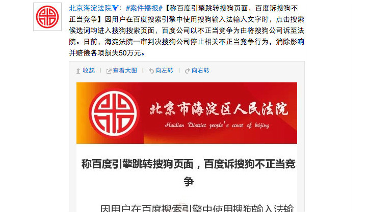 就在 10 月 26 日当天(搜狗投诉百度侵犯 8 项专利权时),搜狗接到了一封来自北京市海淀区人民法院的判决书,判决书认为“搜狗输入法在百度搜索中直接以涉案下拉提示词形式提供搜索候选及差别性对待的行为构成不正当竞争”,要求其赔偿百度各项损失 50 万元。