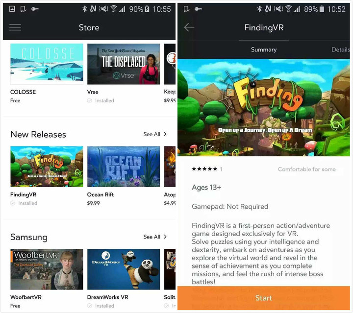 通过 micro-USB 连接 Gear VR 后,手机会引导用户下载 Oculus 商店的 app。综合各方消息来看,目前 Gear VR 只能和 Oculus 商店配合使用。