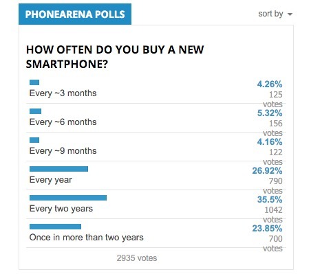 国外手机门户 PhoneArena 发布了这么一则调查,“你多久换一次智能手机?”,目前已有近 3000 人投票。结果显示,近 35% 的网友认为 2 年是最理想的更新周期;此外选择“每年一换”、“两年以上才换”的网友均在 25% 上下;选择“一年内换”的不到 15%。