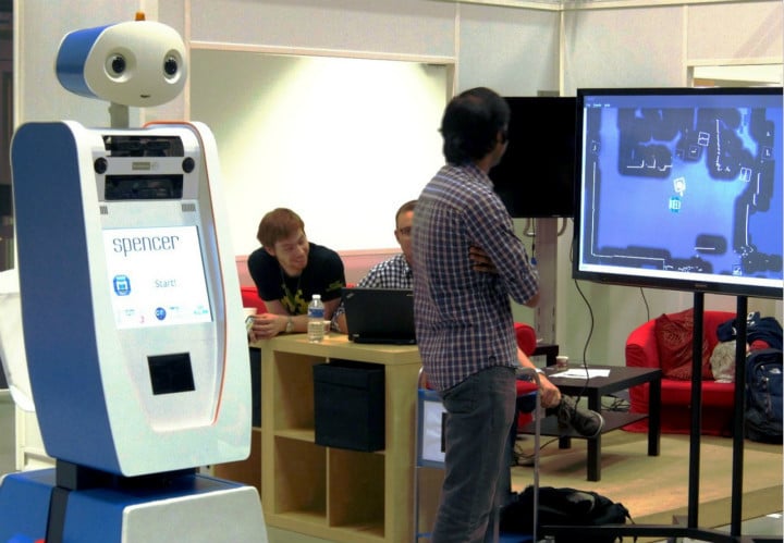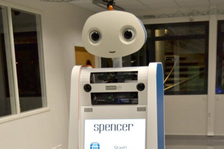 现在,来自五个不同国家的专家学者,在欧盟的资助下,开发出了一款名为 Spencer 的机器人。长得挺萌的,就是没有手臂:
