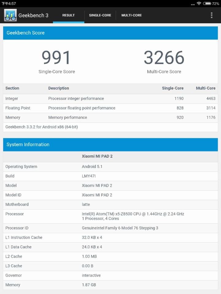 而小米平板 2 在 Geekbench 3 中,单核得分 991,多核得分 3266。这个成绩高于骁龙 801 处理器,同样处于中上水平。