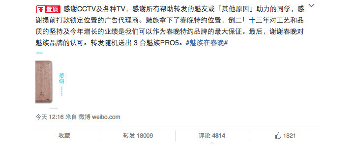 今天中午 12 点,魅族科技发布官方微博,宣布“魅族拿下了春晚特约位置,倒二!”,“感谢 CCTV 及各种 TV”: