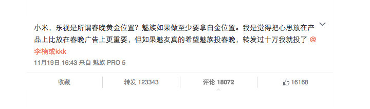小米,乐视是所谓春晚黄金位置?魅族如果做,至少要拿白金位置。我是觉得把心思放在产品上比放在春晚广告上更重要,但如果魅友真的希望魅族投春晚,转发过十万我就投了。