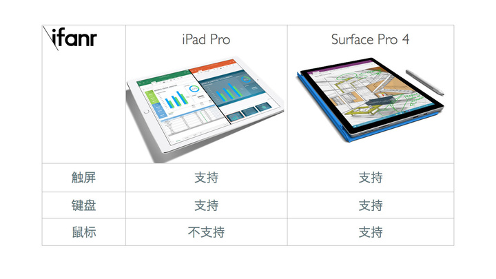 说白了,它们本不应算是同类。其实,iPad Pro 应该看作有键盘配件的平板,而 Surface Pro 4 则应该看作带触控屏的笔记本电脑。