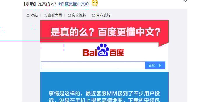 今天下午一点,“高德地图”发布了一条话题为“百度更懂中文”的长微博,还打出了“求助”的字眼: