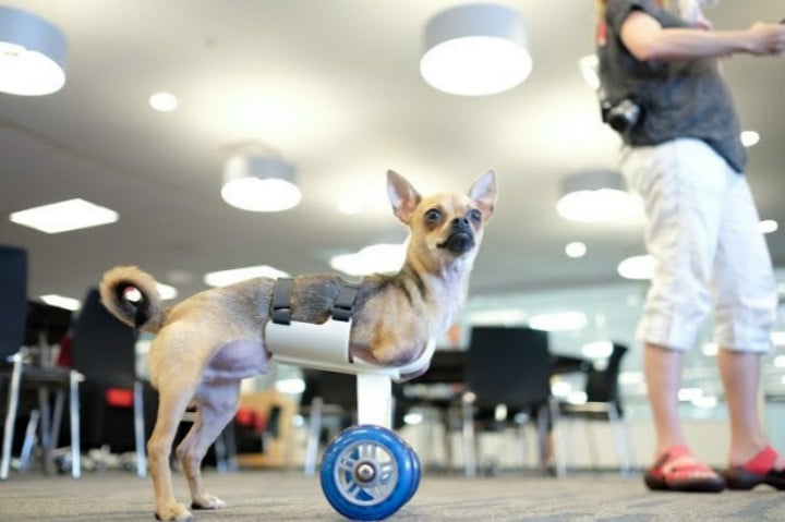 但小狗可能不是很舒服,于是两人就找来圣地亚哥的一个工程师。工程师决定利用他神奇的 3D 打印机,给小狗做出一对完美的前轮。
