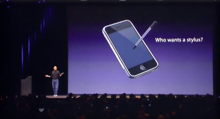 问题关键,在于苹果创始人乔布斯,当年曾经很高调的表示:”我们并不需要触控笔 (Stylus)”:
