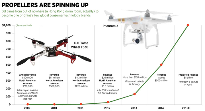 根据著名财经网站 Forbes 的资料,大疆在 2013-2015的三年间,业绩如同火箭一般飙升(上图),正式成为第一所踏进“十亿美元营收俱乐部”的无人机公司。用著名科技媒体 The Verge 的说法:“中国公司首度在全范围内,建立起一个全新的消费电子产品范畴。”