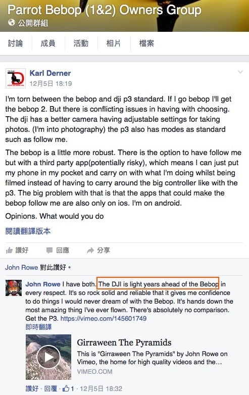 下图是法国无人机品牌 Parrot 的官方用户社群:海外 Parrot 用户竟然在官方社群里,反过向其他人推荐大疆产品,并表示: