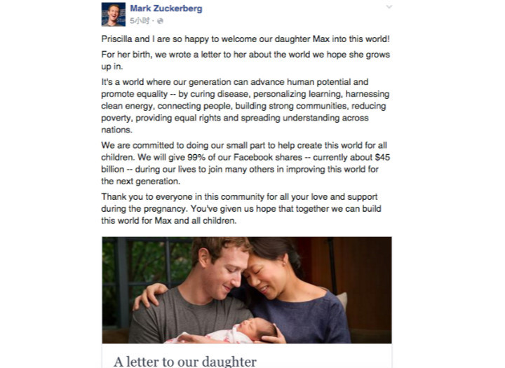 几个小时前,扎克伯格在 Facebook 上宣布了女儿出生的好消息;与此同时,他承诺捐出 Facebook 99% 的股份,用来支持慈善事业的发展。
