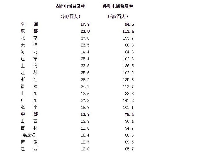 可以看出,固定电话的整体普及率在 20% 到 30% 之间。移动电话普及率都在 60% 以上: