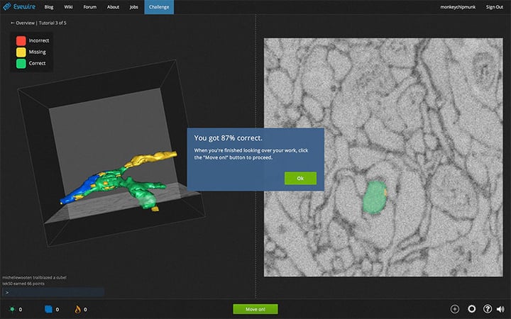 应运而生的就是 EyeWire,它不但是一款有趣而且会让人上瘾的网页游戏,还无形中将这个伟大的任务众包给了每一名玩家。创始人 Sebastian Seung 表示: