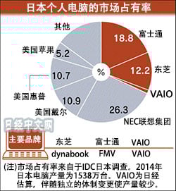 IDC 的数据显示,2014 年全球的 PC 供货量为 3 亿 836 万台。其中,联想、惠普和戴尔的份额合计约占整个市场的一半。而东芝、富士通和 VAIO 三家目前的市场份额合计约为 6%,与苹果 6.3% 的份额相近,而苹果目前排在世界六位。