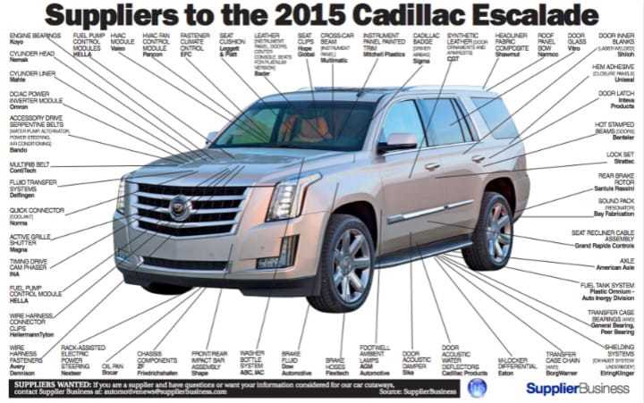 汽车行业进行快速创新的复杂之处在于,汽车制造商基本上是汽车的组装者。它们自己制造的汽车部件很少,相反,几乎所有的关键部件都外包给了一线的供应商,比如博世和大陆集团。看看下面这幅图: