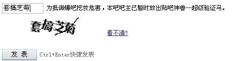 当验证码进入中文互联网世界,为解决以上两种验证码的问题,应运而生了使用中文的验证码。这种在贴吧的防爆吧模式中常见到。