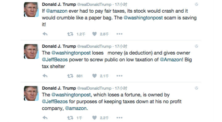 Donald Trump,美国地产大亨,共和党总统候选人。他在周一连发三条 twitter,指责亚马逊依靠《华盛顿邮报》避税,推文如下: