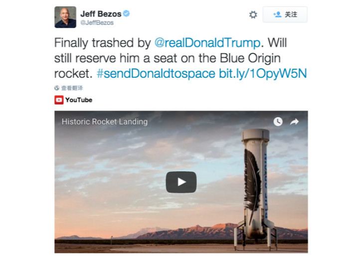 终于被 @realDonaldTrump 给诋毁了。准备在 Blue Origin 的火箭上给他留个位置。