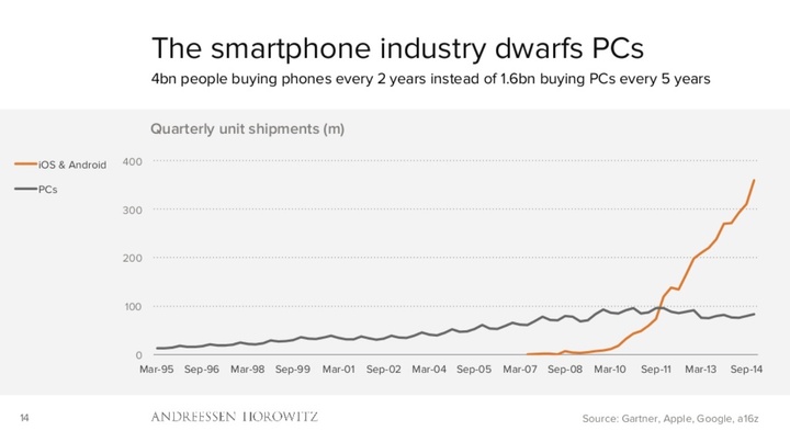 下图是分析师 Ben Evans 所提出“行动设备在吞天食地”的简报:近年移动设备与桌面电脑的差距,已经不是 Chrome OS 初开发时所能相提并论。而自智能手机的兴起对 Chrome OS 的冲击,主要就是 “Web 已死”的论点。Web 是否已死这个并不好说,当时 Techcrunch 就曾经与 Wired 架空论战了一场。在手机上网页较佳?还是用原生应用较好?答案可能见仁见智,但认真的说一句:我真不关心有多少人会在智能设备上看网页。