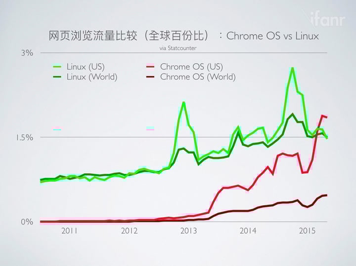 下图是截至 2011 年 1 月至 2015 年 11 月 Statcounter 统计的网页浏览流量 (Web Traffic) 比较(以作业系统统计)。无疑,Chromebook 增长是很“高速”,但自 2011 年三星推出第一台贩卖用的 Series 5 开始,五年来 Chrome OS 无论增长速度有多高,但全球网页浏览量仍然连个整数也不到,即使是美国范围内也只是 1.5%,仅仅比小众的 Linux 要好一点--但是,一台只能用来上网的机器的网页流量,居然和一台极客经常用来玩游戏、码码字的的多功能电脑差不多,那更不要说与 Android 相提并论。