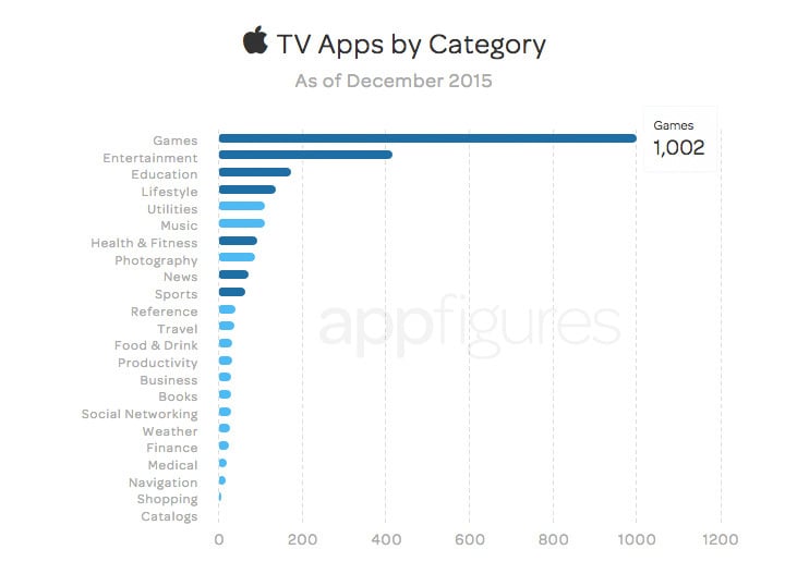 在 tvOS 上的 2624 个应用中,游戏类占了 1002 个,是所有品类中最多的。苹果负责互联网软件与服务的高级副总裁 Eddy Cue 在接受 BuzzFeed 采访时认为 Apple TV 有机会像 iPhone 一样扩展大众游戏市场:
