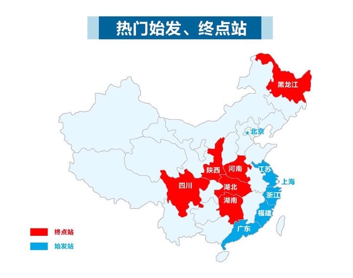 年前热门的回家始发站主要集中在广东、江苏、北京、上海、浙江、福建,其中从北京出发的车票最是难买。而热门终点站为四川、湖北、河南、湖南、陕西、黑龙江。