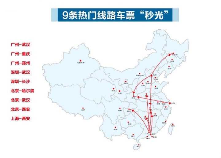 根据节前的抢票情况,这 9 条线路基本秒空:广州-武汉,广州-重庆,广州-郑州,深圳-武汉,深圳-长沙,北京-哈尔滨,北京-武汉,北京-西安,上海-西安。如果过几天要抢与这些路线相反的返程车票,可得提早练好手速了。
