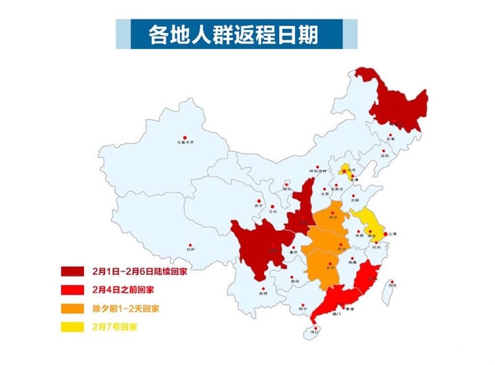 四川、陕西、黑龙江三地因路途遥远,人群集中在 2 月 1 日-2 月 6 日陆续返家。