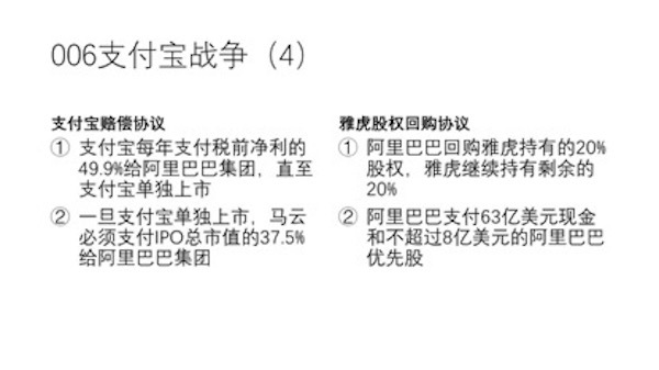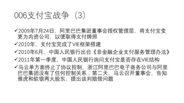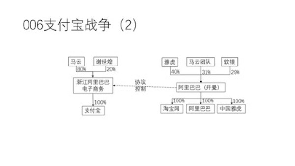 关于支付宝战争,根据双方事后的官方公布,支付宝的 VIE 结构是雅虎和软银同意而马云团队去搭建的,所以就不存在马云团队“盗窃”一说。