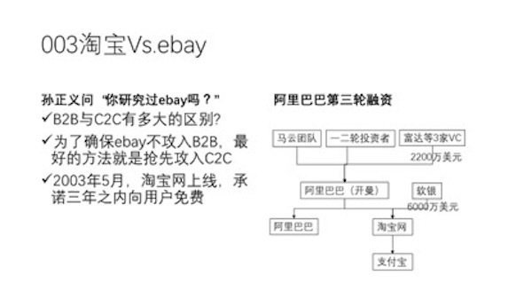 2003 年,马云团队的战略决策是,只有首先进攻 C2C,才能保证 ebay 不进攻 B2B。换言之,马云团队其实想在 C2C(即日后的淘宝网,免费的 C2C 业务)采取烧钱式价格战,根本不是为了淘宝网日后的盈利,而不过是为了最大限度冲击 ebay 的中国 C2C(即 ebay 易趣,收费的 C2C 业务)。