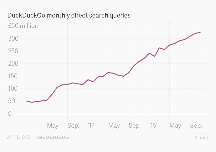 据 QZ 报道,截至今年 12 月 15 日,DuckDuckGo 收获了 32.5 亿次直接搜索请求,相对去年增长了 74%。文中还提到一组数据,DuckDuckGo 仅在 10 月份就吸引了 300 万桌面端独立访问者,较去年增长了超过一倍。尽管在移动为王的今天桌面数据没太多的说头,但也不妨碍 DuckDuckGo CEO 坚定看好“隐私用户”的市场潜力: