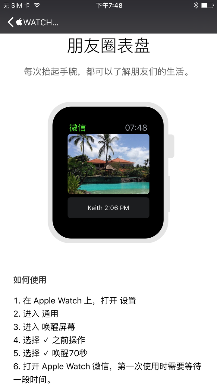 重点当然还是要在微信的设置里,详细教导用户(上图)如何“取代” Apple Watch 的原生表盘:因为用户不能改用第三方表盘,所以教学的内容用只是更改设定唤醒表盘的动作。