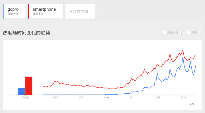 凑巧地,很多分析都指 GoPro 的大爆发,与社交网络策略有极大的关系,而社交网络恰巧也是智能手机的强项。上图是 Google 趋势中对“智能手机”和”GoPro”两个关键词的分析:两者的搜索次数,可能会因为不同的关键字组合而有所不同,所以意义并不太大;但两者搜寻量变化的趋势,基本上可以分别反映两者的发展趋势。