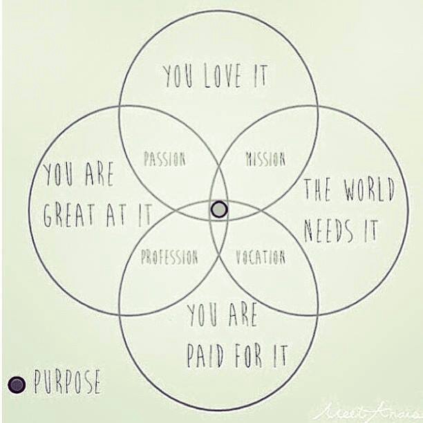 下面是一张我曾经见到过的图表,描述的是人生的意义:它是你的喜好、你所擅长的事情、世界需要的东西和你能得到的金钱补偿的交叉地带。当然,找到特定的方向是非常有挑战性的。把你所喜爱的东西精简为可行动的部分,可能是极为困难的。