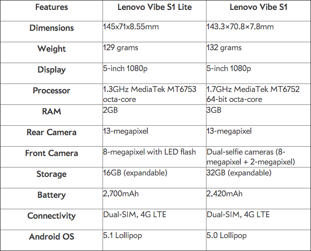 Vibe S1 Lite 与 Vibe S1 在配置上的区别如下图: