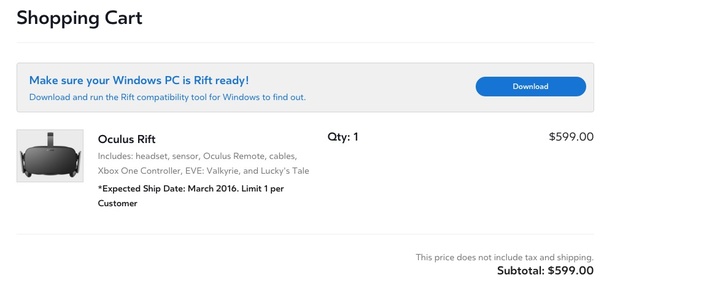 Oculus Rift 消费者版售价显示在预订页面上——599 美元,限定一人一台。按发稿时的汇率换算,Oculus Rift 售价约为人民币 3925 元。这个价格还没有包括税费和运费。