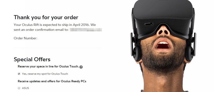 预订成功后会看到下面这样的页面,这里显示发货日期为 2016 年 4 月,3 月发货的已经没了。下方还有预订 Oculus Touch 的选项。