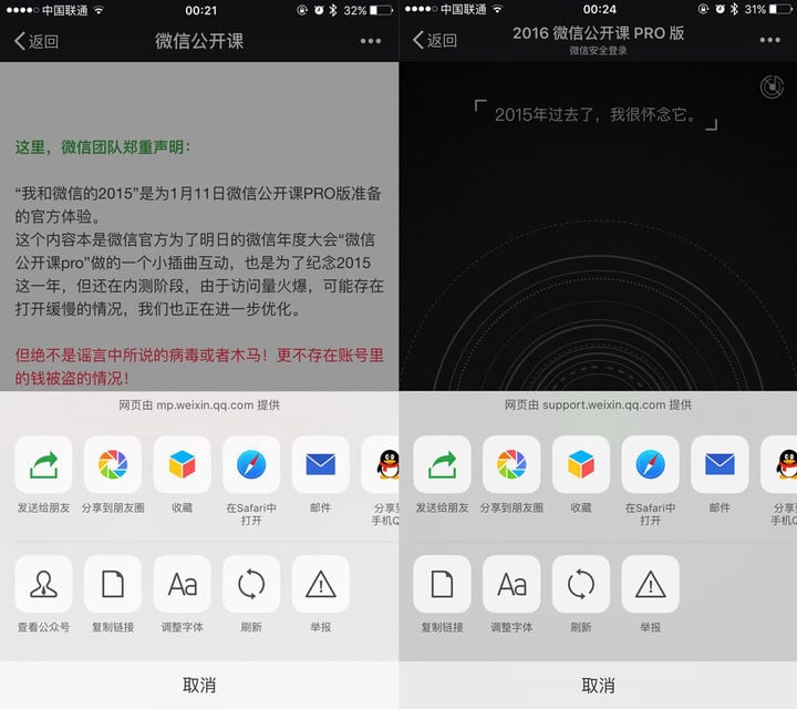 另外值得注意的是,上图中『2016 微信公开课 PRO 版』标题下方『微信安全登录』字样在几个小时前是没有加上的。这显然是微信的补救措施。这六个字,就是早先缺少的,权威性。看下图做对比。