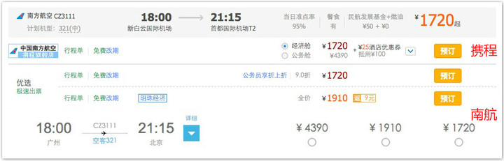 实际效果是 OTA 不再有价格优势,如下图,同一时间、同一航班从广州飞往北京的机票价格完全一致。