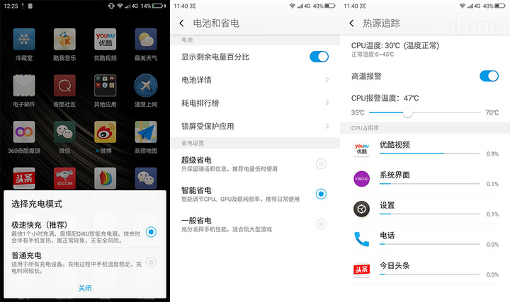 在桌面放置了一键加速,加速完还可以深度清理加速;低电量还会提示开启超级省电模式;在充电线插上的一刻也会提示你是否使用了支持闪充的充电器,闪充仅需一小时充满,但可能会有手机微热的情况出现。