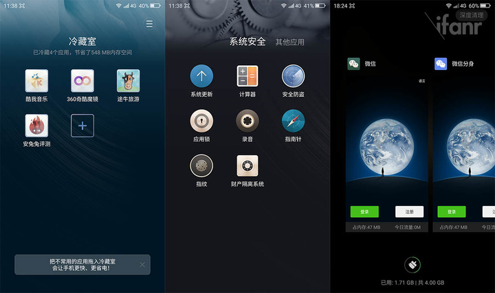 安全功能多到还有类似的财产隔离,骚扰信息拦截、防止应用自启动以及应用冷藏室(15 天未用自动冻结)等等。