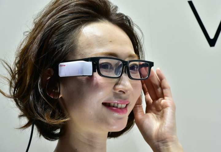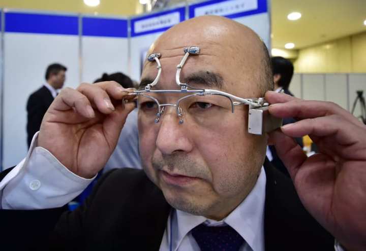 日本智能眼镜公司 hakugan 的总裁 Hiroyuki Sasaki 展示了一个能通过传感器来展示脑电波图形的智能眼镜设计。