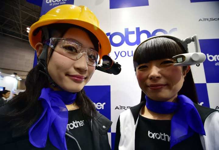 两位模特展示的是由一家日本办公用品公司开发的智能眼镜。从头盔处伸出的机械臂可以为用户提供现实增强的显示效果。