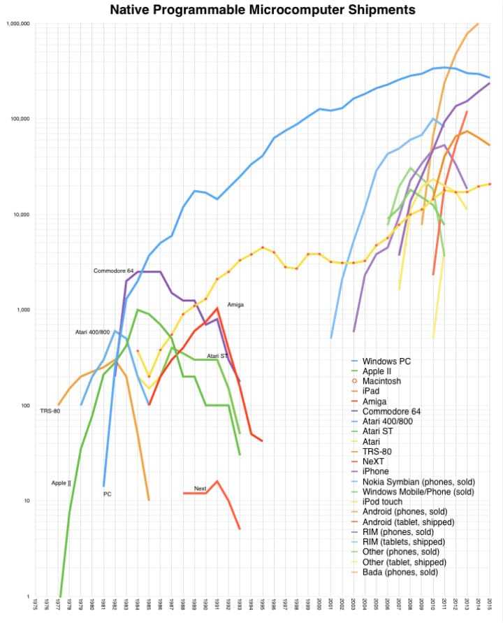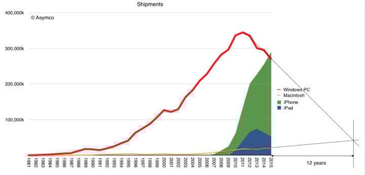 昨天本站李编辑用 IDC 和 Gartner 统计的 2015 年第四季度全球 PC 销量说明了 PC 的式微,而今天 Asymco 的分析员 Horace Dediu 则在 Twitter 公布了几张更加详细的图表,展现这些年 Windows PC 出货量是怎么被 iOS 设备赶上的。