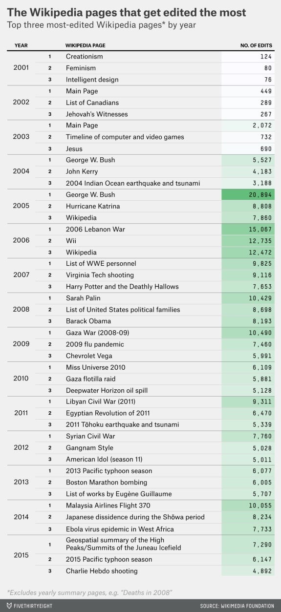 在这 15 周年纪念之际,维基百科基金会分享了一份数据,公布了在词条猛增的过去十五年里,被改动过次数最多的词条。