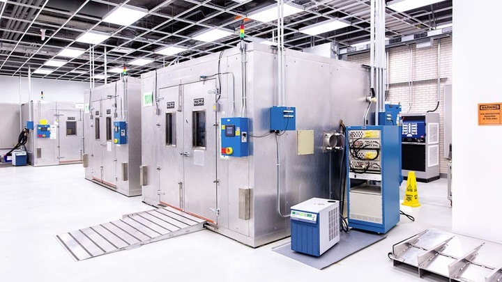 在这里,老旧的 V8 引擎不复存在,占据实验室的是 18 个巨大的钴蓝色盒子(每个盒子高 10 英尺,宽 8 英尺)组成的方阵。它们看起来有点像是步入式冷冻柜,其实这么说也不算太离谱。当我们穿行过去的时候,Nitz 说,它们是气候模拟机。他解释说,电池的化学反应对温度和湿度极其敏感,而电动汽车需要承受住各种不同的天气状况。