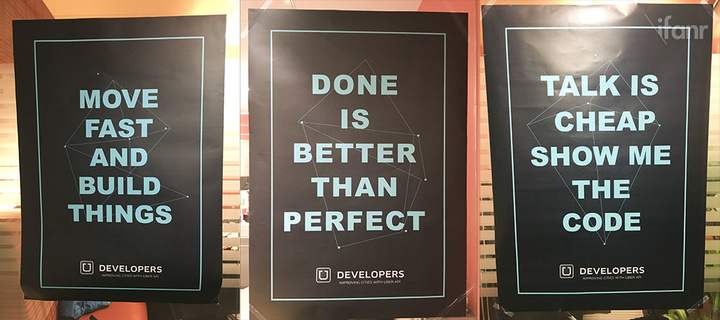 另外值得一提的是,Uber Hackathon 现场贴着三张标语——“Move Fast and Build Things”, “Done is Better than Perfect”, “Talk is Cheap, Show Me the Code”。这三句话正好突出了参加 Hackathon 这类活动要义: