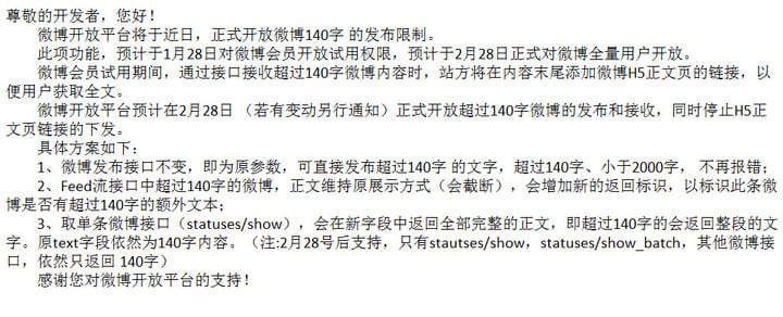 信息中表示,微博对开发者发送了一则通知,通知中表示,微博将会开放 140 字的限制,该功能初定才 1 月 28 日对微博会员开放,2 月 28 日对所有微博用户开放。届时,用户可直接发送超过 140 字、小于 2000 字的微博。