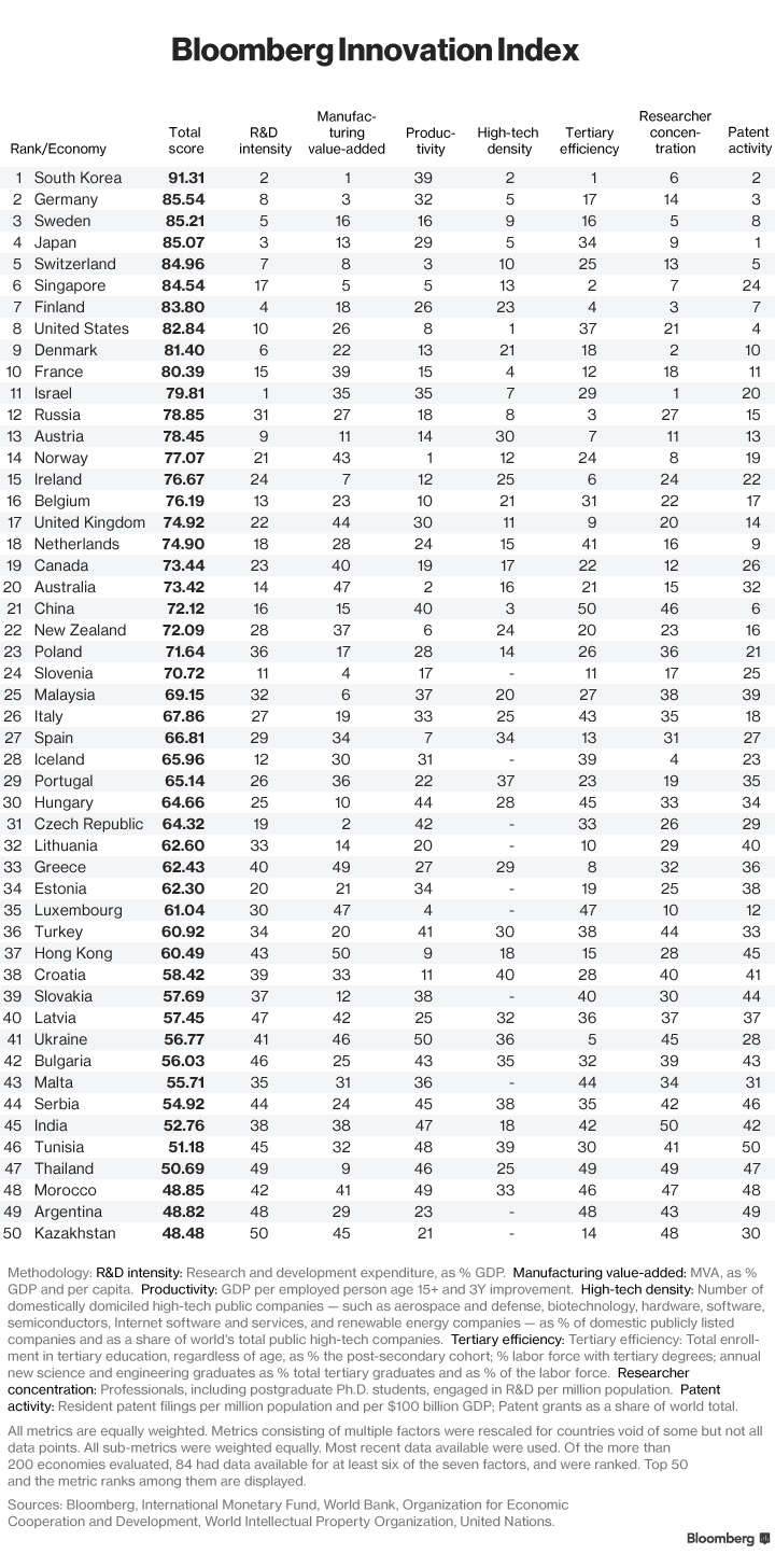 在科技成为世界经济头号发动机后,各种大会上地球的精英们言必称创新。彭博社今天发布了 2016 年“彭博创新指数”,按照下列标准给世界各国的创新力排了个序: