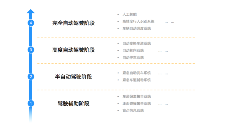 依据沃尔沃的划分,要实现完全智能驾驶,需要经过四个阶段:驾驶员辅助阶段、半自动驾驶阶段、高度自动驾驶阶段和完全自动驾驶阶段。